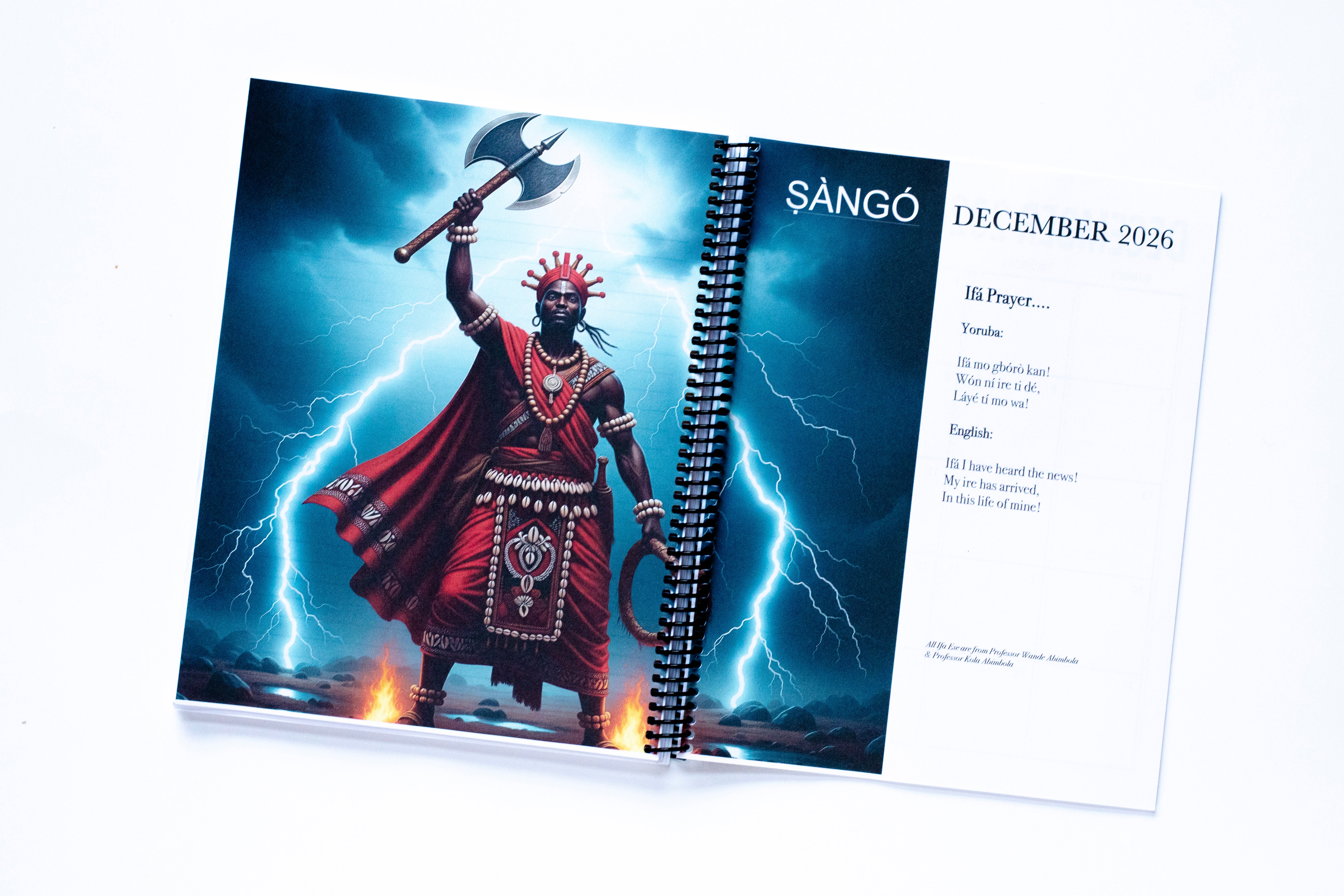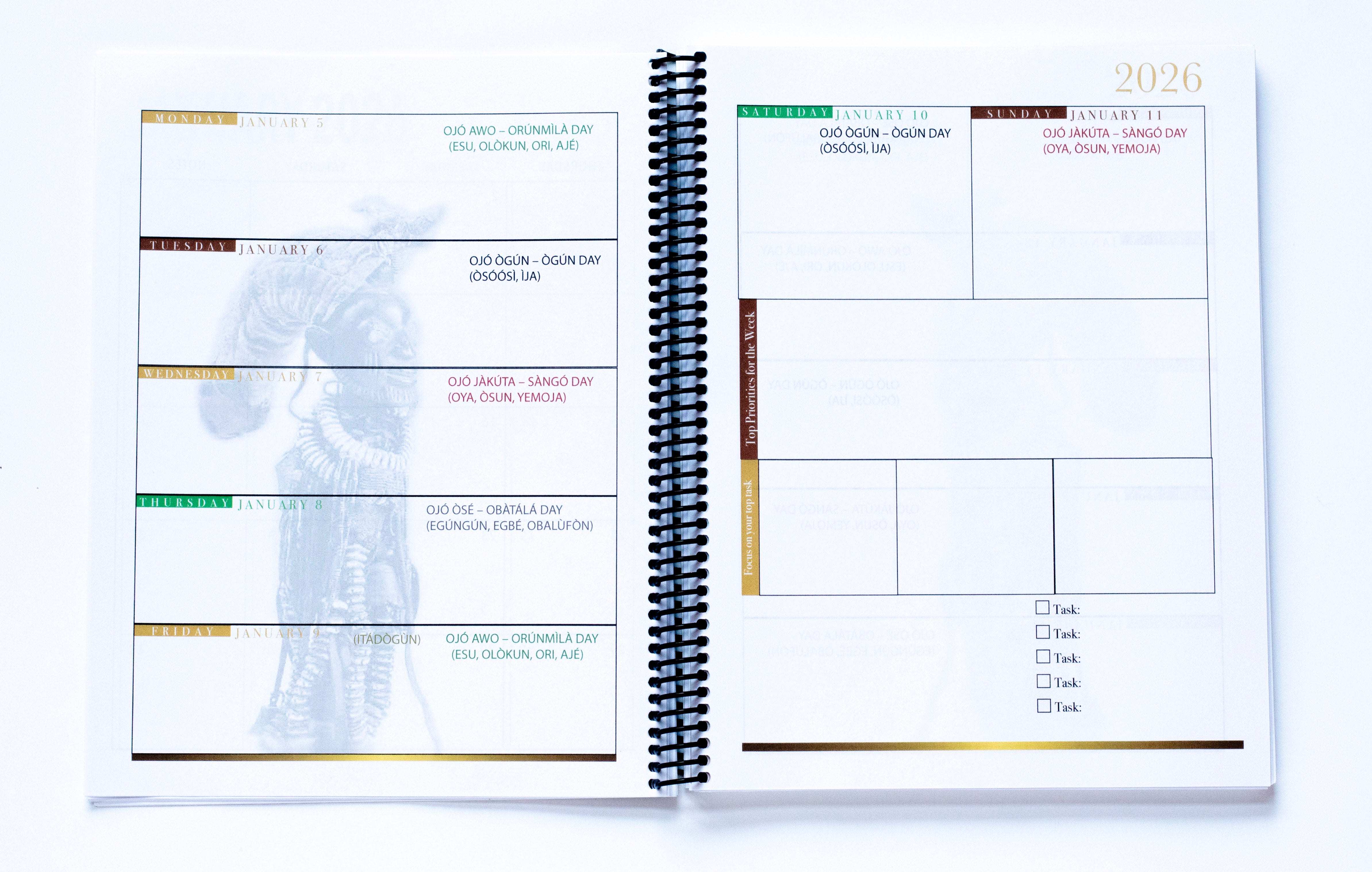 Our Sacred 2026 Ifá Days & Òrìṣà Planner helps you stay connected to the natural rhythm of the Ifá four-day week—every single day of the year clearly marked with its corresponding Òrìṣà. With full-color imagery, intuitive layouts, and space to plan deeply, this planner supports your spiritual practice while helping you stay organized.